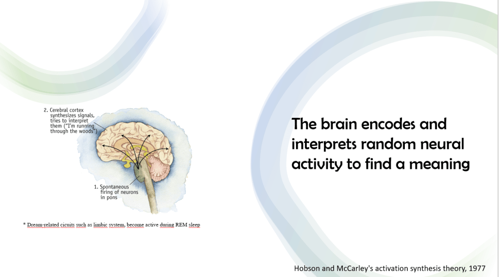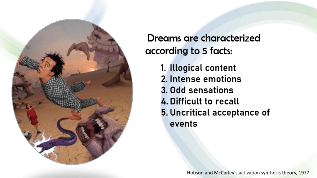 In 1977 two biologists, Hobson and McCarley, devised the activation-synthesis model contradicting Sigmund Freud’s (1900) theory of dreaming. Hobson´s theory suggest that dreaming is something random that occurs mainly for biological reasons without neccesarily entailing a crucial meaning.