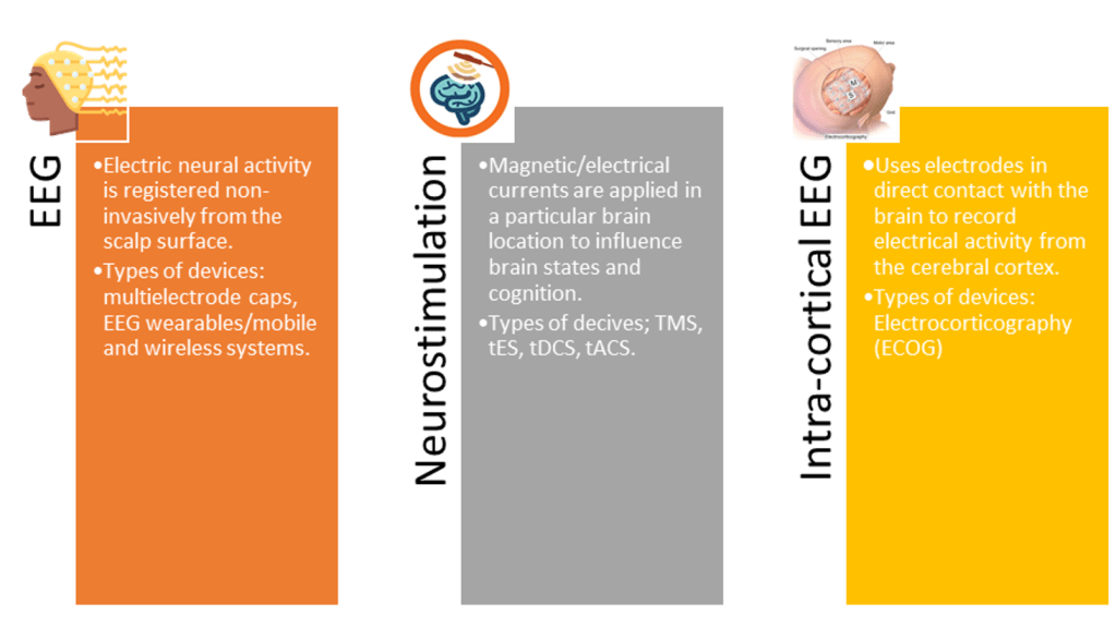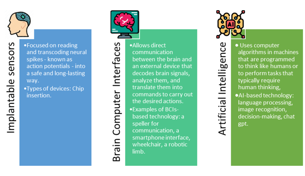 There is a bit of math complexity behind but basically, BCIs technology uses modern machine-translation algorithms and automatic speech recognition methods (e.g. artificial speech synthesizers) to figure out what the brain is thinking. To read the brain signals, it utilizes wireless intracortical recording electrodes or intracranial electroencephalography (iEEG). The data is then processed by a computer algorithm that can interpret the information and provide insights into the individual’s mental state, intentions or thoughts. In more simple terms, it consists of translating in real-time the brain activity (e.g. specific neural networks) related to speech (e.g. dialogue) directly to text or sound (Metzge et al, 2022).