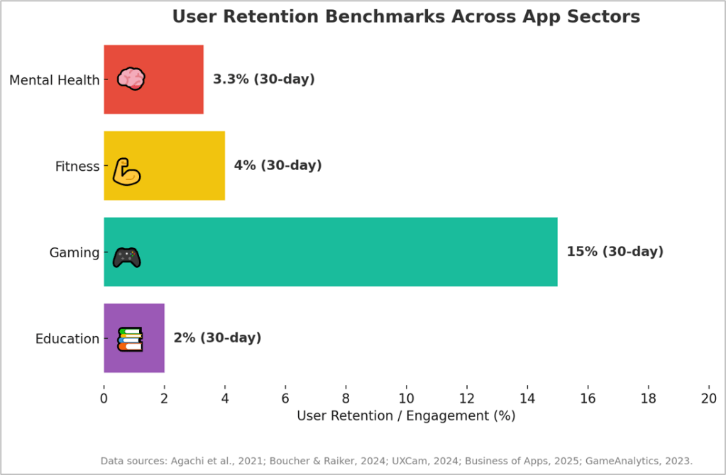 For instance, in digital mental health apps, the median 30-day retention is just 3.3% (Boucher & Raiker, 2024). Longitudinal studies also reveal a significant decline pattern in user engagement over time. Critically, after 78 weeks, approximately 70% of users become inactive, 18% exhibit moderate usage, and merely 12% remain highly engaged (Agachi et al., 2021; Boucher & Raiker, 2024).